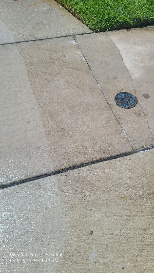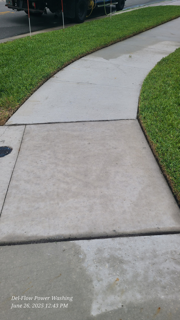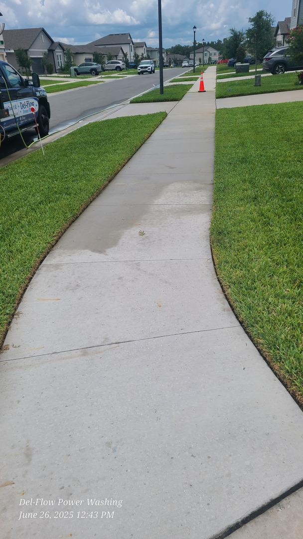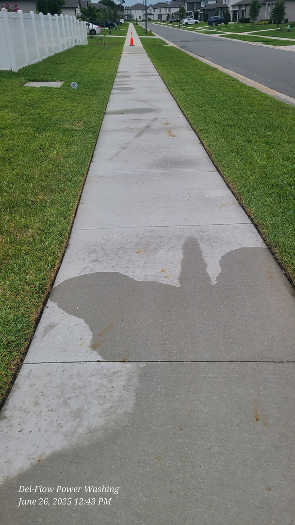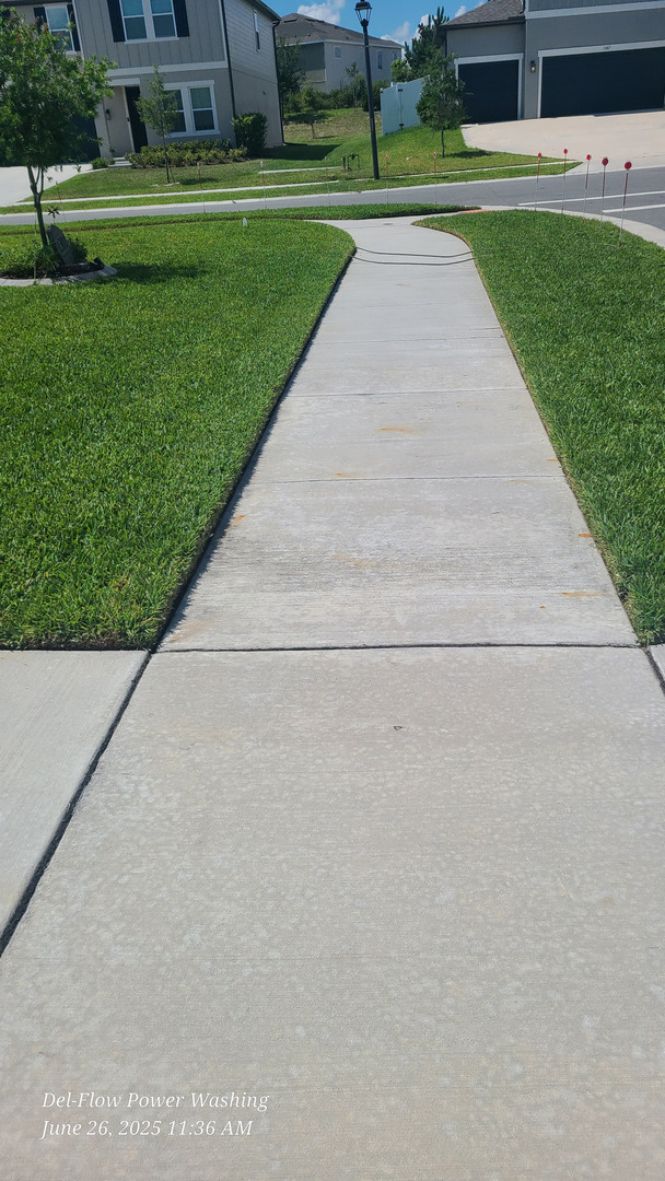 Del-Flow Power Washing recently embarked on a project located in Deltona, seated in the heart of Volusia County, Florida’s sun-soaked beauty. The client was in dire need of our top-tier concrete pressure washing and cleaning service. This newly built property featured a sleek concrete driveway, front walkway, and adjacent sidewalks that had unfortunately lost some of their appeal due to developing mold, mildew, and surface grime.